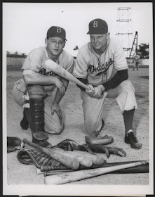 I just can't wait for Spring, so when I come across a press photo showing some Dodgers' preparing for the upcoming season I have to share it here. Featured above is Brooklyn catcher Bruce Edwards with youngster Tom Tatum, dated 2/24/1947 (eBay auction link). Per the descriptor on the reverse: